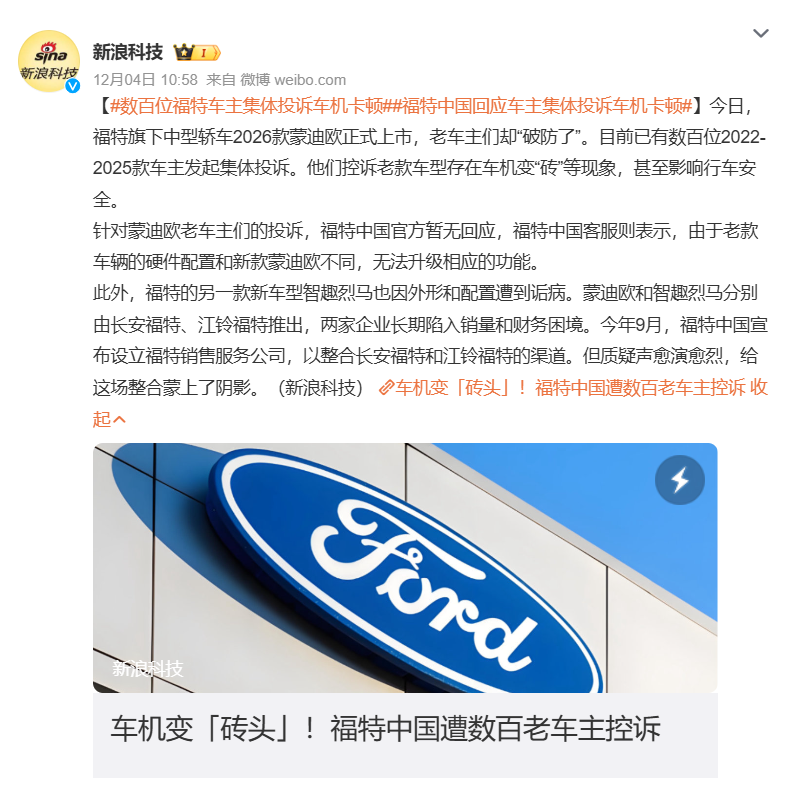 2026款蒙迪欧上市发布会上智能配置的介绍语音刚落,数百名老用户集体投诉车机卡成“砖头”的信息,却已经引发广泛的关注。
