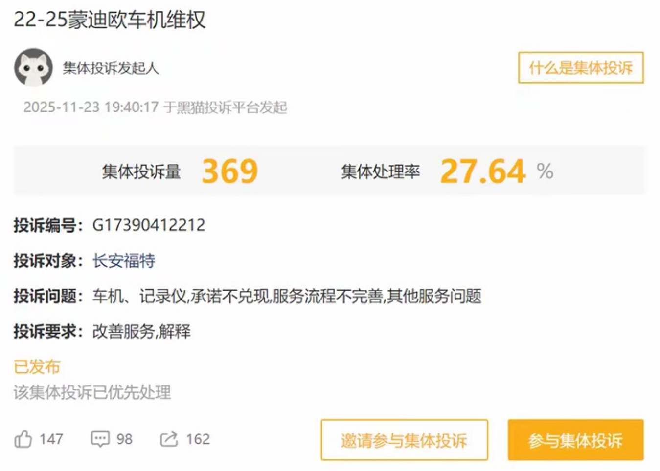 从目前的信息来看,截至2025年12月初,已经有超过360名2022-2025款蒙迪欧车主在投诉平台发起集体投诉,核心诉求直指老款车机系统严重卡顿问题。