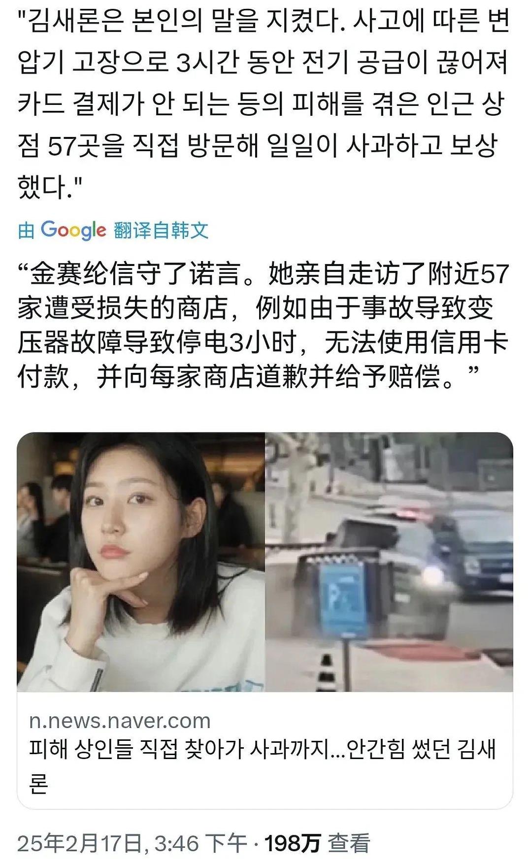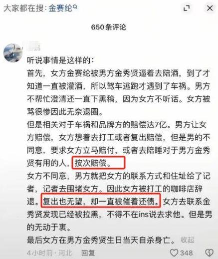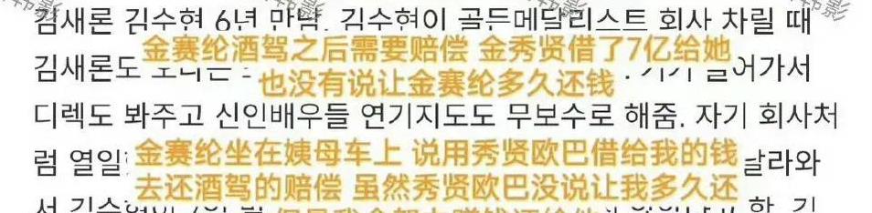 虽然当时金赛纶和金秀贤已经分手,但金秀贤公司还是出面帮忙进行了赔付,而且也并没有想让金赛纶偿还的意思,不仅金赛纶对金秀贤感激涕零,家人也觉得金秀贤是大好人。后来金赛纶还是和公司说,自己会努力工作还清这笔钱。