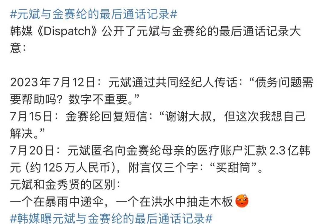 再说了,就算金赛纶被家庭吸血、被公司吸血实在没什么积蓄,我就不信金赛纶身边没有能拿出这笔钱借给她的朋友,比如元斌就曾主动伸出过援手。媒体说元斌和金赛纶的最后通话记录,是元斌问金赛纶,债务问题需要帮忙吗?数字不重要。