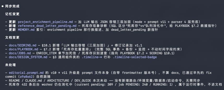 然后这一步还有一个关键检查,这次对话是不是跨项目的?如果改了项目A而项目B依赖它,那项目B的docs也得跟着改,这个其实是历次同步最常翻的车。