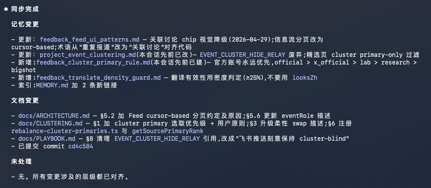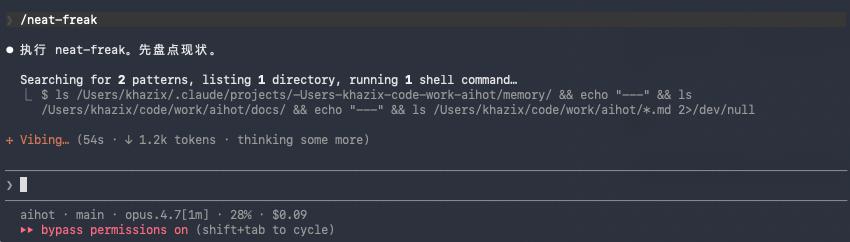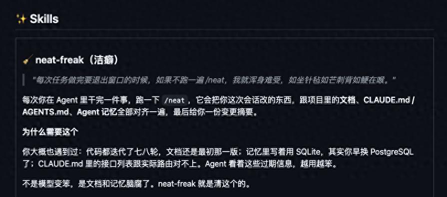 做的事大概就是,每次你在Agent里,做完一个功能或者又解决了一个BUG,就调用这个洁癖Skill,然后说一声帮我全面审查一下或者直接就/Neat一下,它就会自动审查你整个项目的文档体系和记忆文件,然后根据这次对话,把该改的文档、记忆、CLAUMD.md进行迭代,确保非常干净之后,最后,再给你一份变更摘要,让你知道改了啥东西。