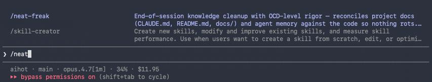 我把洁癖.skill一般当类似于游戏的存档机制用,这次要结束了,要存档了,就运行一下/neat,然后,下次打开一个新的会话,还可以接着来。