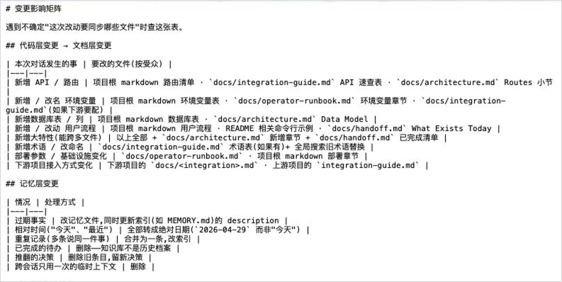 第二步,用我的变更影响矩阵文档去识别一下需要改什么。不只看对话里有什么新事实,也要去看新事实会波及哪些文档层级。