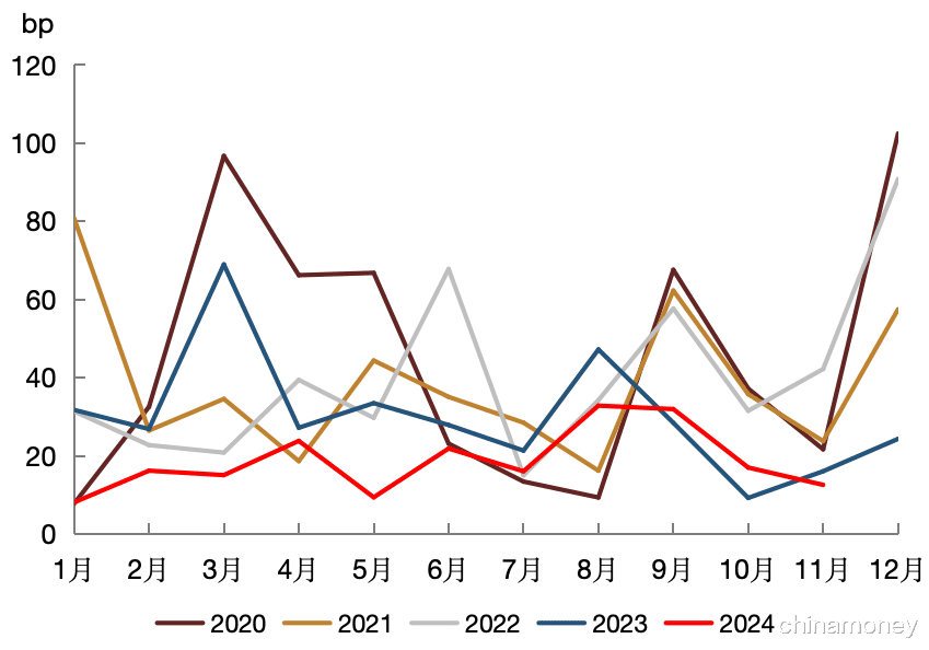 9月美联储开启降息进程,外部紧缩环境缓解,同时国内稳增长压力有所加大,月末时点,央行宣布实施包括降准、降息以及降低存量房贷利率等一系列刺激政策,以提振市场信心。在降准、加大公开市场投放量等操作下,银行间流动性进一步宽松,尤其是大行净融出规模回升,带动资金利率中枢整体回落,同时10月受股市阶段性回暖带动,货基、理财、债基等曾面临一定赎回压力,流动性重回银行体系,R与DR利差有所走阔。步入11月,一揽子化债政策落地,年内置换类地方债供给压力抬升,叠加月中缴税影响,资金利率与政策利率偏离度有所走扩。11月29日,市场利率定价自律机制发布《关于优化非银同业存款利率自律管理的倡议》,要求非银同业存款利率纳入自律管理,提及除金融基础设施机构之外的其他非银同业活期存款应参考公开市场7天期逆回购操作利率合理确定利率水平,对应12月以来同业存单等货币市场利率快速补降。