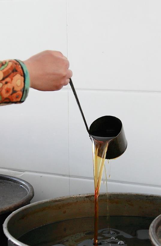 最后的沉淀过程更要耐得住性子,足足等上七天,才能得到一瓶清澈透亮的上等香油。