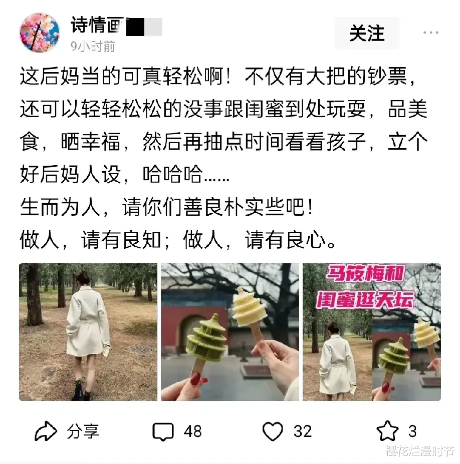 还有人说马筱梅当后妈当得轻松,有钱花有乐子。我就纳闷了,人家就不能有点自己的时间,跟闺蜜一起享受享受生活吗?孩子们上学的时候,人家出来玩儿一玩儿,这不是很正常嘛?怎么就被你们说得那么不堪呢?