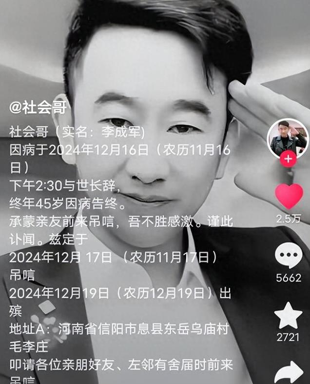 原来,这个视频是“社会哥”的妻子发的,她表示,“社会哥”已经于12月16日下午两点半病逝,年仅45岁。