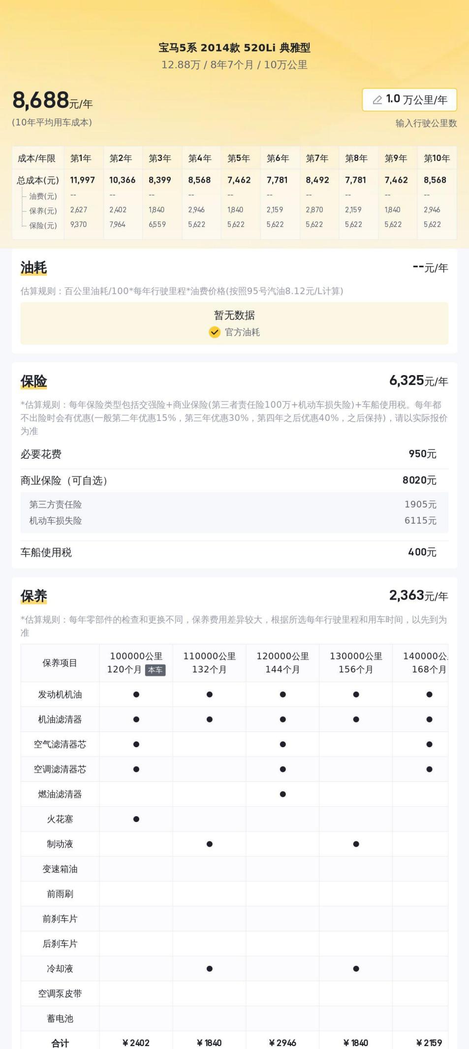 除了车况和价格,用车成本也是一个需要考虑的重要因素。根据数据统计,宝马5系的平均年用车成本大约在1.3万元左右,包括燃油费、保险费、保养费、维修费等等。当然,这只是一个平均值,实际情况会因个人用车习惯和车辆状况而有所不同。如果车辆出现一些大的故障,维修费用可能会更高。