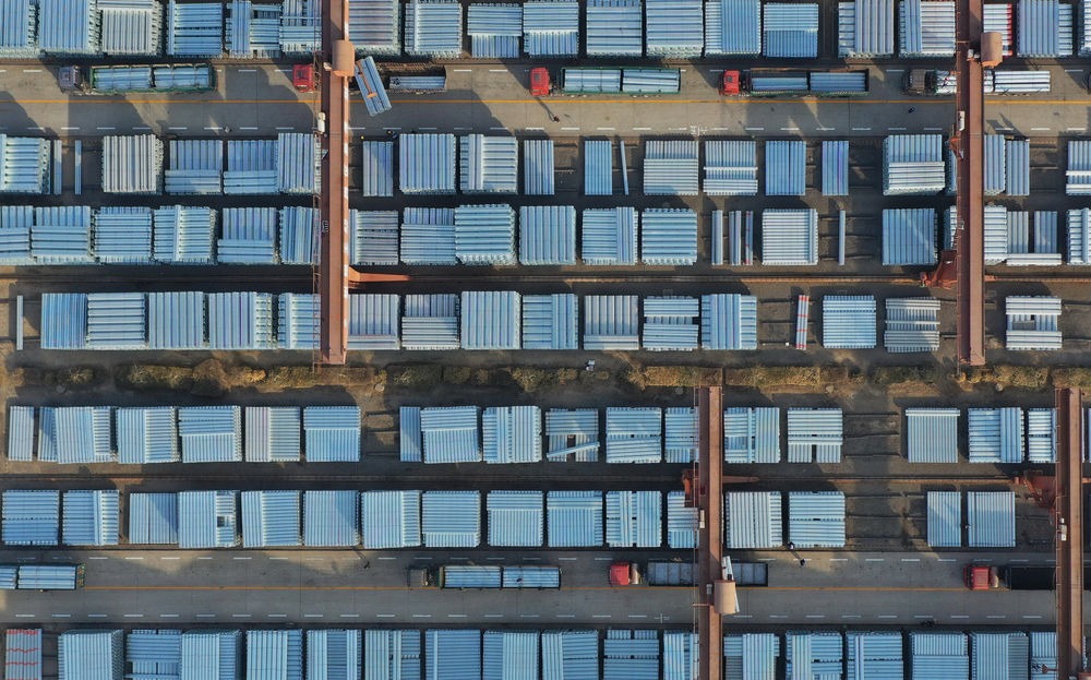 ↑2月19日,工人在唐山市丰南区一家镀锌钢管企业仓储区操作设备吊装镀锌钢管(无人机照片)。新华社记者 杨世尧 摄