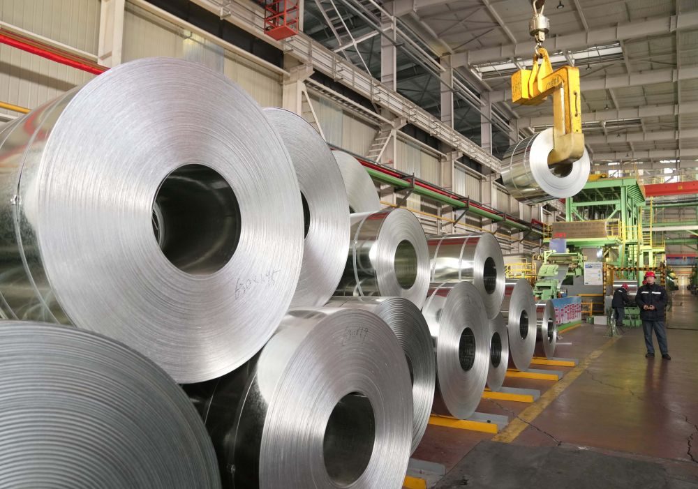 ↑2月19日,工人在唐山市丰南区一家镀锌钢板企业操作设备吊运镀锌钢板。新华社记者 杨世尧 摄