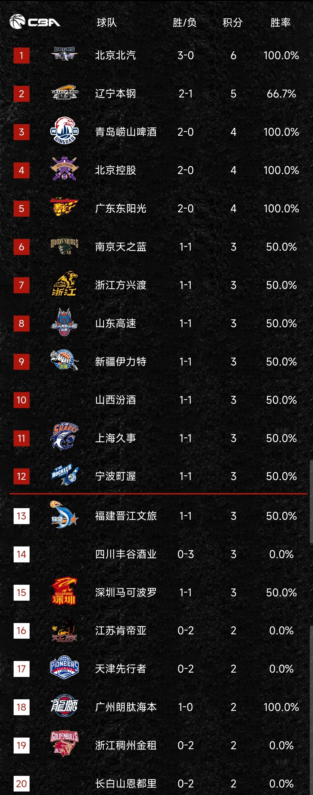 上当是各支球队具体排名,目前三连胜的球队只有北京首钢男篮,两连胜的球队有:青岛男篮、北控男篮和广东男篮。一胜一负的球队有:南京同曦男篮、浙江广厦男篮、山东男篮、山西男篮、上海男篮、宁波男篮、福建男篮和深圳男篮。两连败的球队有:江苏肯帝亚男篮、天津男篮、浙江稠州男篮和吉林男篮。广州男篮只打了一场比赛,战胜了四川男篮,而四川男篮是唯一一支三连败的球队,之所以排名第14,是因为多打了一轮比赛。