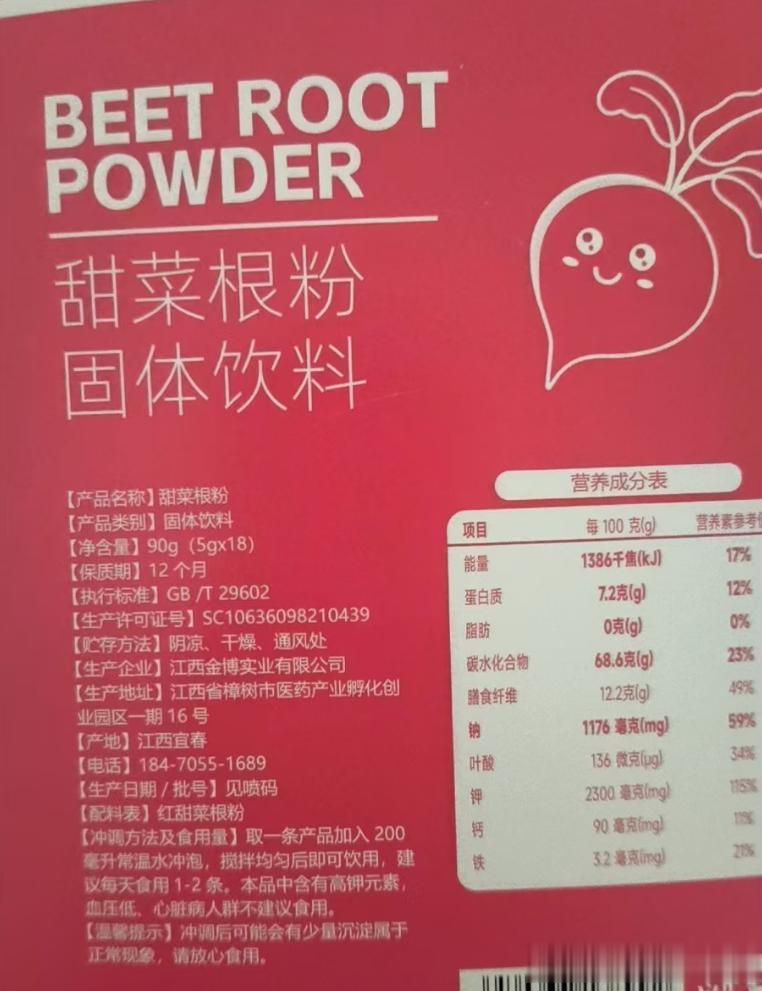 营养成分(产品包装标注):每100克含有——· 蛋白质 7.2g· 膳食纤维 12.2g· 钾 1176mg(接近日需的一半)· 叶酸 136μg(约日需的三分之一)· 铁 3.2mg(约日需的20%)这些数据与甜菜根本身的特点相符,钾、叶酸和膳食纤维确实是它的强项。