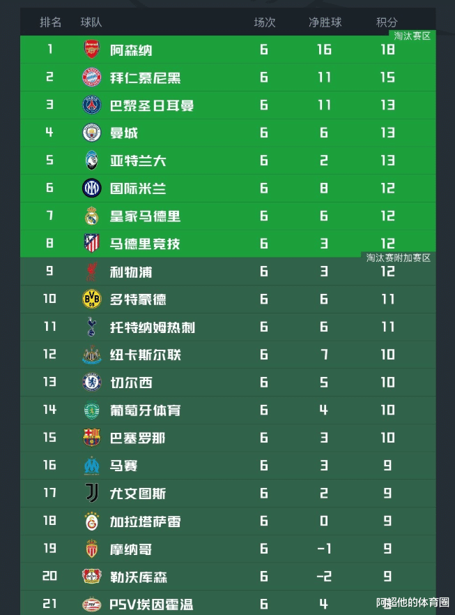 其他位列附加赛区域的还有11分的多特蒙德和热刺;纽卡斯尔、切尔西、葡萄牙体育和巴塞罗那则都是3胜1平2负积10分依次排在第12至第15位。这些球队距离前八晋级区都只需要一场胜利即可;在欧冠剩下2轮的情况下,还有一定的机会冲击晋级区。