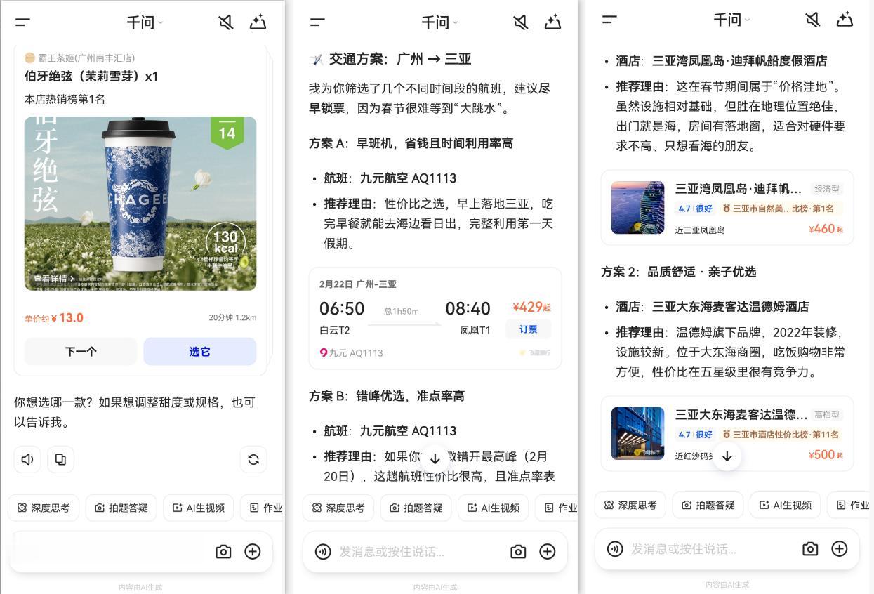 举几个例子你就明白了:点奶茶你对千问说:“帮我点两杯霸王茶姬的伯牙绝弦。”→ 它会自动打开淘宝闪购,选好商品,确认地址,用支付宝付款,全程不用你跳转到其他App。买装备你说:“下周要去四姑娘山徒步,需要准备什么?”→ 千问不仅列出清单(冲锋衣、登山鞋、头灯等),还会直接推荐淘宝上靠谱的商品,你一点就能下单。订机票+酒店你说:“春节想去三亚,帮我订1月28日的往返机票和海边酒店。”→ 千问调用飞猪,自动比价、选航班、订房间,甚至能结合高德地图告诉你酒店离海滩多远。办政务你问:“杭州户口怎么办护照?”→ 千问立刻告诉你需要哪些材料、去哪里办、是否能线上申请,并直接带你进入办理页面(通过支付宝政务服务)。