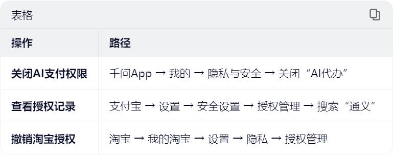 所有AI发起的交易请求,都会被记录在你的支付宝/淘宝账单中,标注为“通过通义千问发起”;你可以随时在 支付宝 → 账单 → 筛选“服务” 中查看明细;如果发现异常,24小时内可申请“AI误操作赔付”(阿里已上线该保障)如果实在担心的话,可以按照以下方法关掉权限: