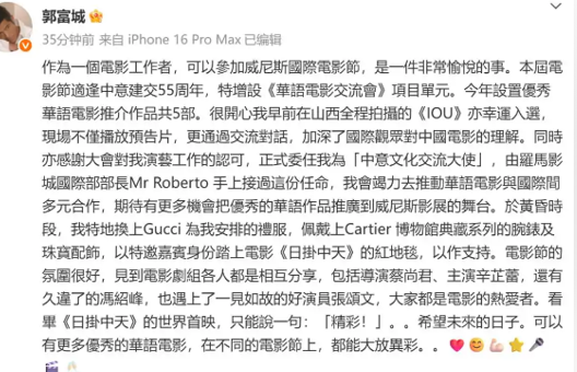 他本人也表示,会竭尽全力推动华语电影跟国际接轨,让更多优秀的华语作品走出去,登上威尼斯这样的国际大舞台。