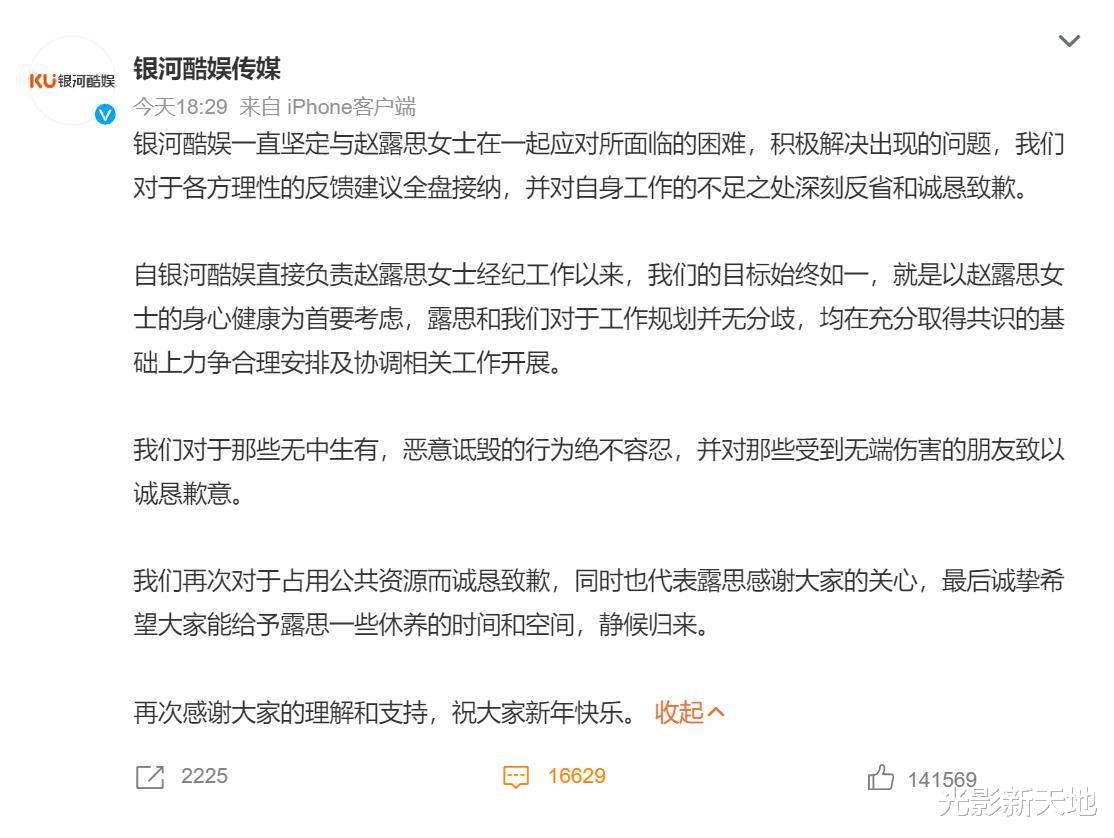 再来看公司前CEO的朋友圈,银河酷娱签赵露思的时间是在2016年9月份。通常娱乐圈经纪公司和艺人签约,年限约定俗成的有2年、5年、10年等选项。至今赵露思还是银河酷娱的艺人,说明双方合约至少10年。但是如果只有十年,合约到期是2026年9月份,一年半的时间,赵露思忍忍也就过去了,等到合约到期、和平分手,双方面子都好看。