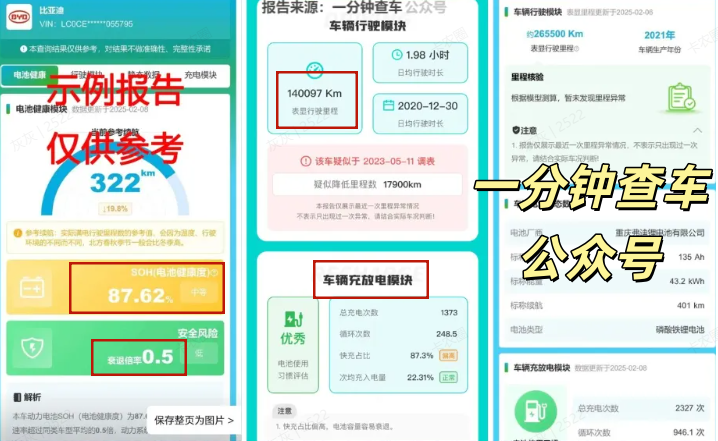 3. 第三方工具:灵活度高,日常自检够用有两种方式,大家根据需求选。一是搜“一分钟查车”这类有备案的,输入车架号,1-3分钟就能调出BMS数据,能看到SOH值、快充占比、衰减倍率、快充占比等等,适合想快速初筛一下的情况。