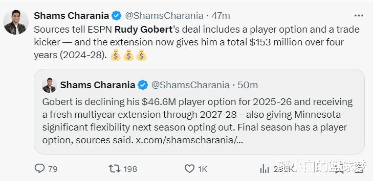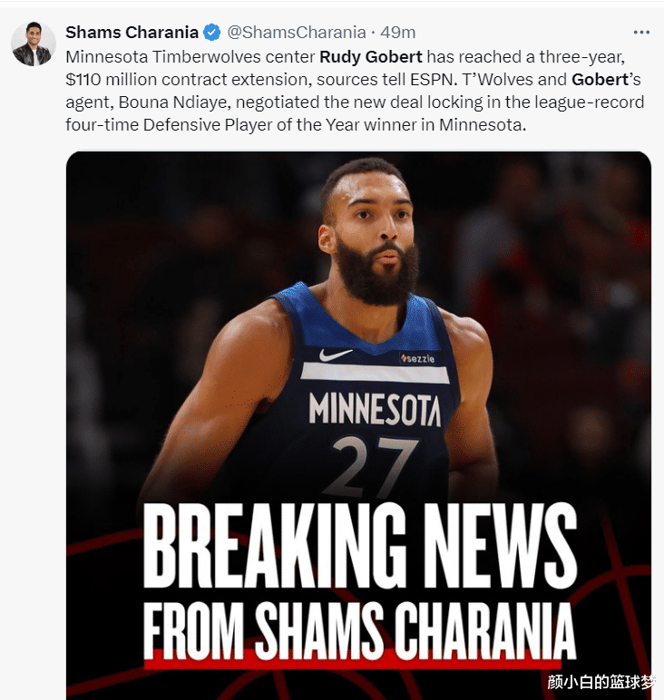 北京时间10月23日,根据ESPN记者Shams报道,明尼苏达森林狼与戈贝尔达成了三年1.1亿的提前续约合同。这份合同细节是戈贝尔拒绝了25-26赛季4665万的球员选项,自25-26赛季到27-28赛季进行这三年1.1亿,算上他24-25赛季的4382万,他未来四年可以赚超过1.5亿。