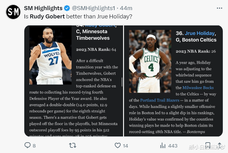 在ESPN的排名中,戈贝尔是第35,霍乐迪是第36,结果霍勒迪得到了四年1.35亿的长约,而戈贝尔只得到三年1.1亿,这说明外界看来戈贝尔是不如霍乐迪的存在,他排在霍乐迪之前都不应该。
