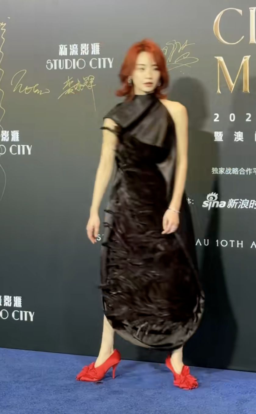 金像影后刘雅瑟的造型就更加标新立异了,可能是为了首尾呼应,一头红发配了一双红色高跟鞋,中间裹着一件设计繁复的黑裙。