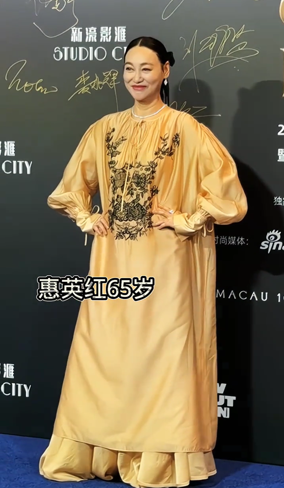 六十几岁还在时尚圈所向披靡的惠英红,一套宽松的黄色长裙,她能驾驭各种设计感十足的礼服,但这一套太压身高。