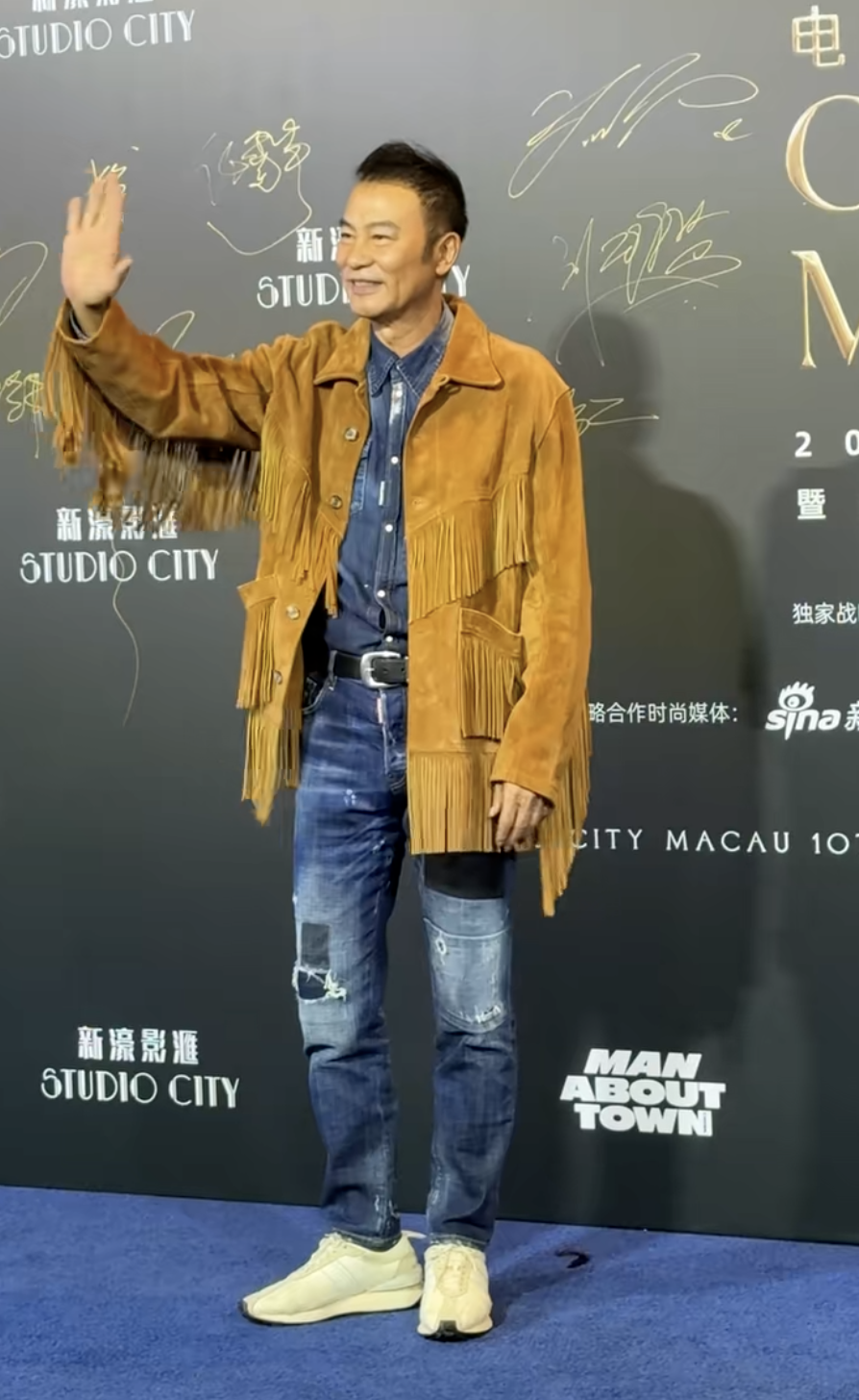 一个是一身休闲打扮的任达华,造型很清爽,一身牛仔衣配运动鞋,加穿流苏外套,打扮得很年轻,脸、身材也一点不像古稀老人。