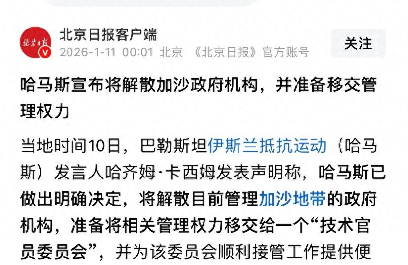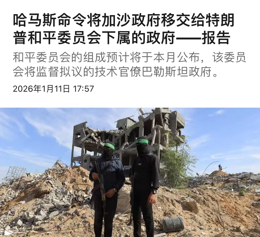 1月11日,哈马斯对此公开有了一个回应,那就是他们准备解散目前自己控制的加沙政府,哈马斯发言人哈泽姆·卡塞姆在视频声明中说:“根据美国总统特朗普打算成立加沙地带和平委员会的声明,哈马斯运动已向所有政府实体和机构发出指示,准备将所有权力移交给这个独立的巴勒斯坦技术官僚委员会。”