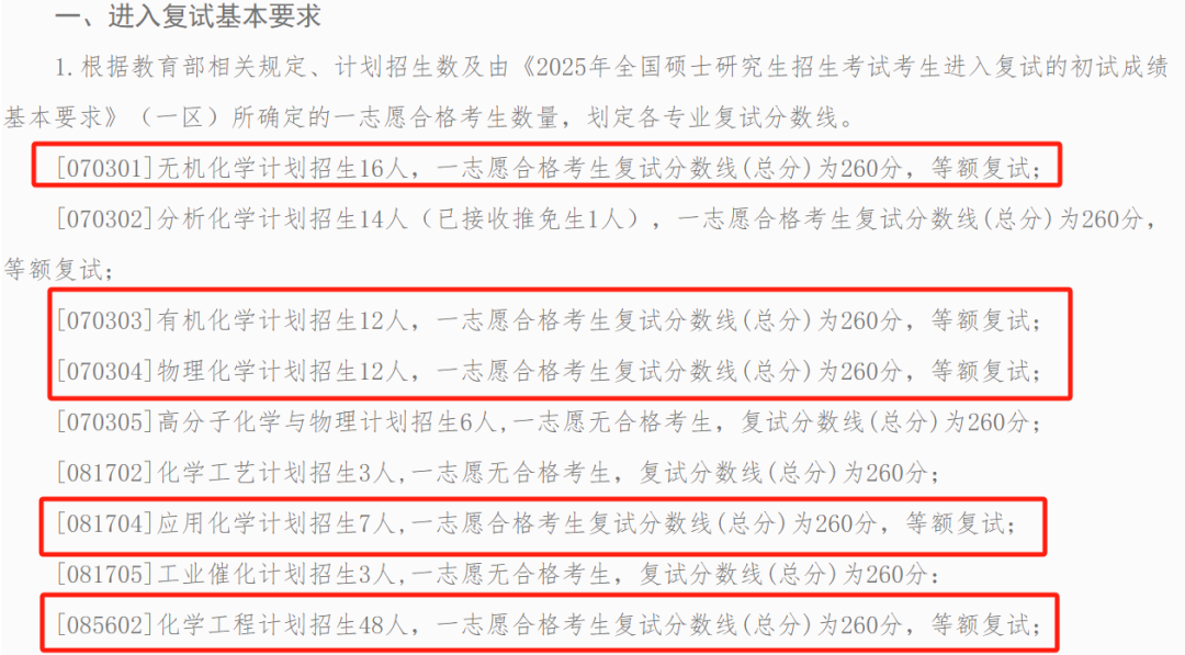 化学院[070301]无机化学、[070303]有机化学、[070304]物理化学等专业等额复试