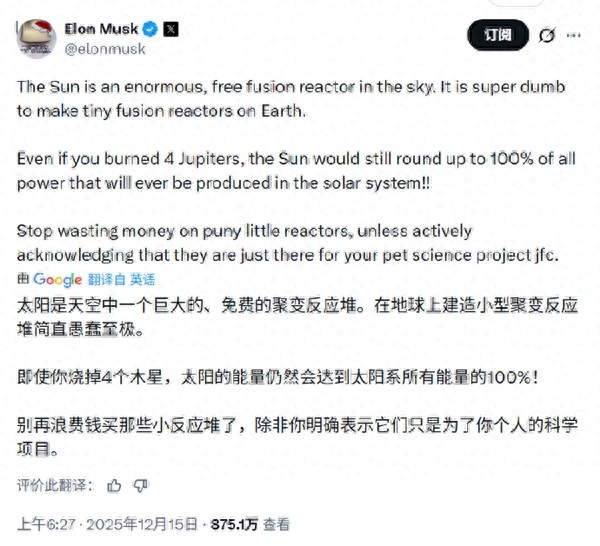 他指出,太阳本身就是一个悬挂在天空中的巨大且免费的聚变反应堆,试图在地球上复制这种机制制造“微型版”是极其愚蠢的行为。
