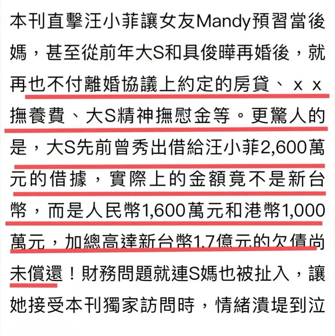 更要命的是,还有汪小菲之前借给大S的2600万,据说用来开酒店的。