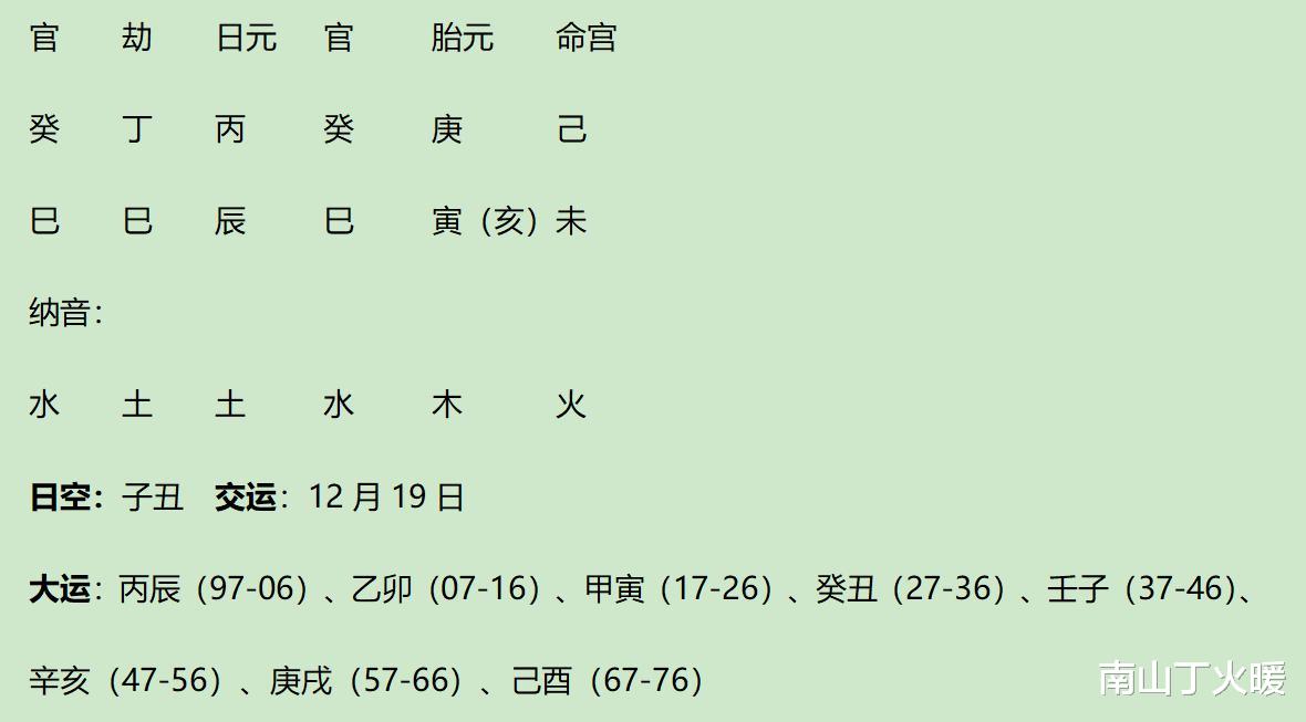 大运壬杀合丁劫,小限己伤制癸杀(癸官过强而似杀);大运子与胎元寅夹丑,流年未与年支巳拱午,小限巳与命宫未拱午。