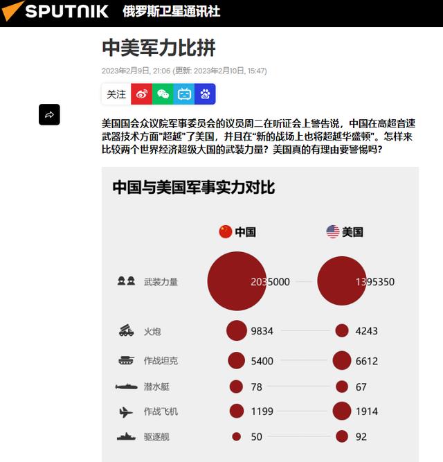 2023年2月9日, 21:06 来源:俄罗斯卫星通讯社《中美军力比拼》