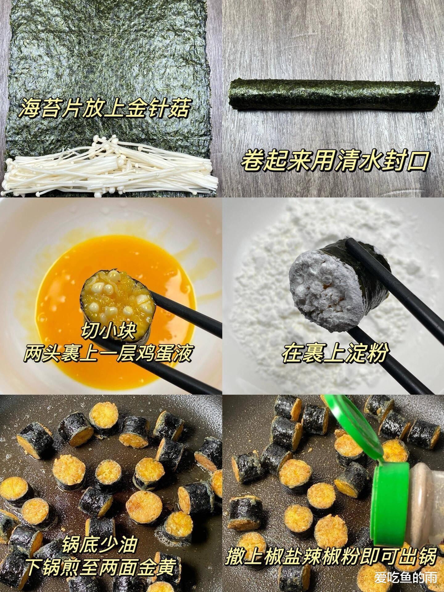 做这道菜简直不需要任何厨艺门槛,简直是“有手就行”系列的天花板。首先是选材,金针菇要挑那种菌盖没完全打开、根白白净净的,捏起来硬挺不软塌的才新鲜;海苔就用平时吃的即食波力海苔,不用搞复杂的寿司海苔,越简单越好吃。这里有个关键小技巧:金针菇切掉老根后,千万别直接卷,要先放进开水里焯水30秒!这一步是为了给金针菇“瘦身”,挤出多余水分,不然卷的时候容易散架,下锅煎的时候还会溅油。焯好水后一定要用力攥干,像拧毛巾那样,越干越好裹。