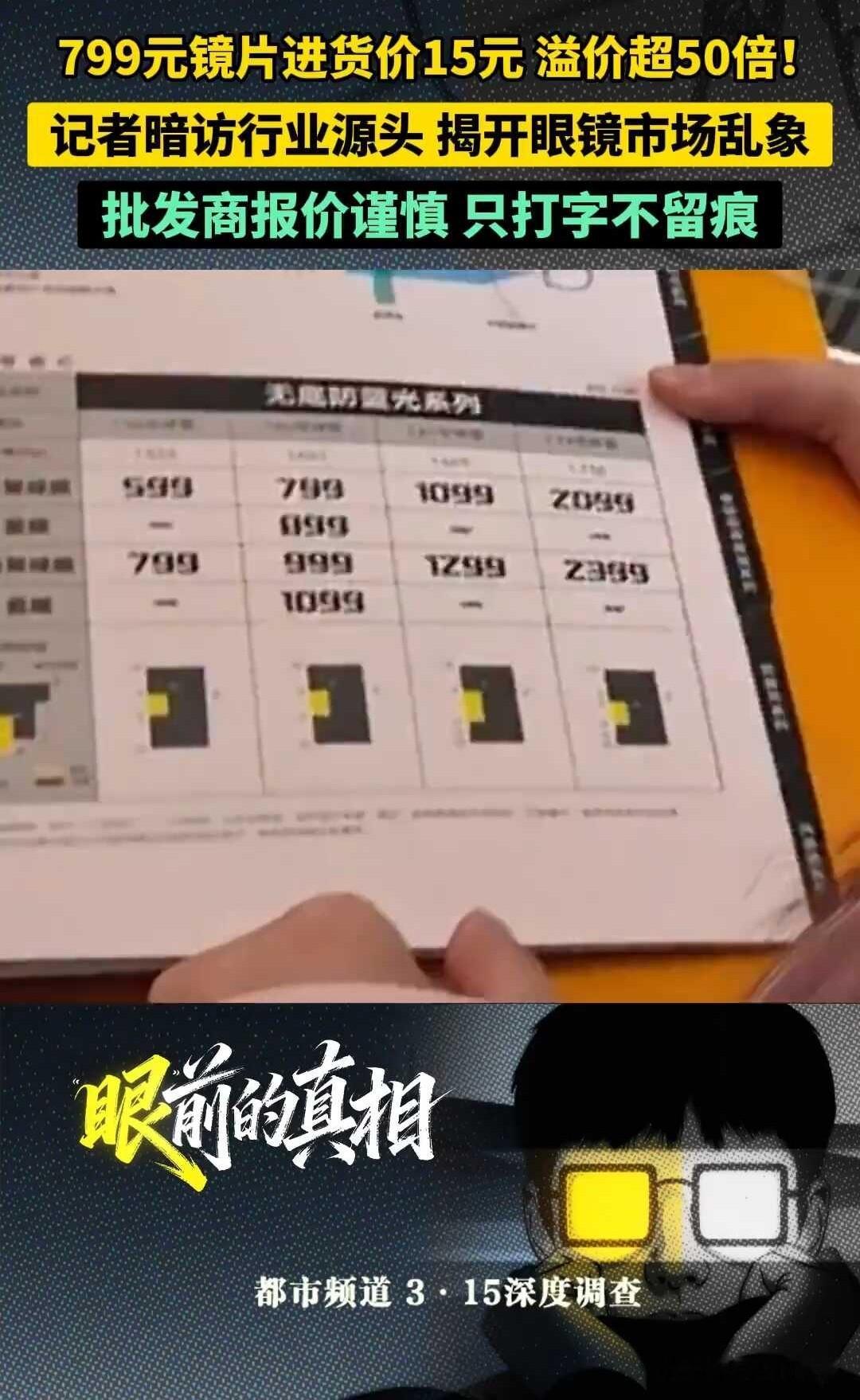 一款在门店标价799元的1.61折射率镜片,源头批发价仅15元,溢价超过50倍。