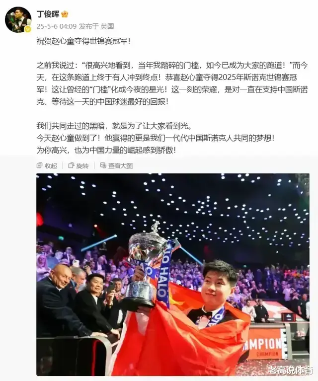 丁俊晖发文祝贺赵心童夺冠