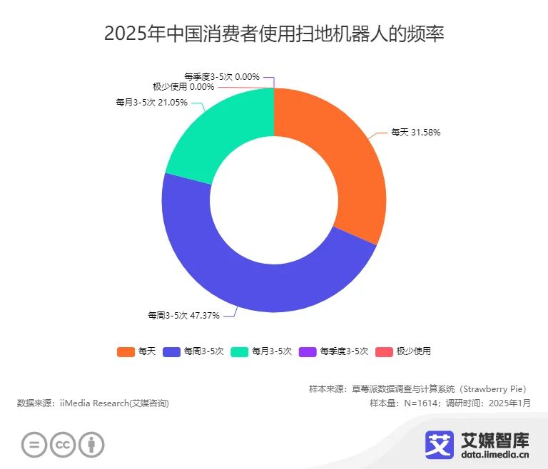 iiMedia Research(艾媒咨询)数据显示,在2025年中国消费者使用扫地机器人的频率中,31.58%消费者选择每天,47.37%消费者选择每周3-5次,21.05%消费者选择每月3-5次。