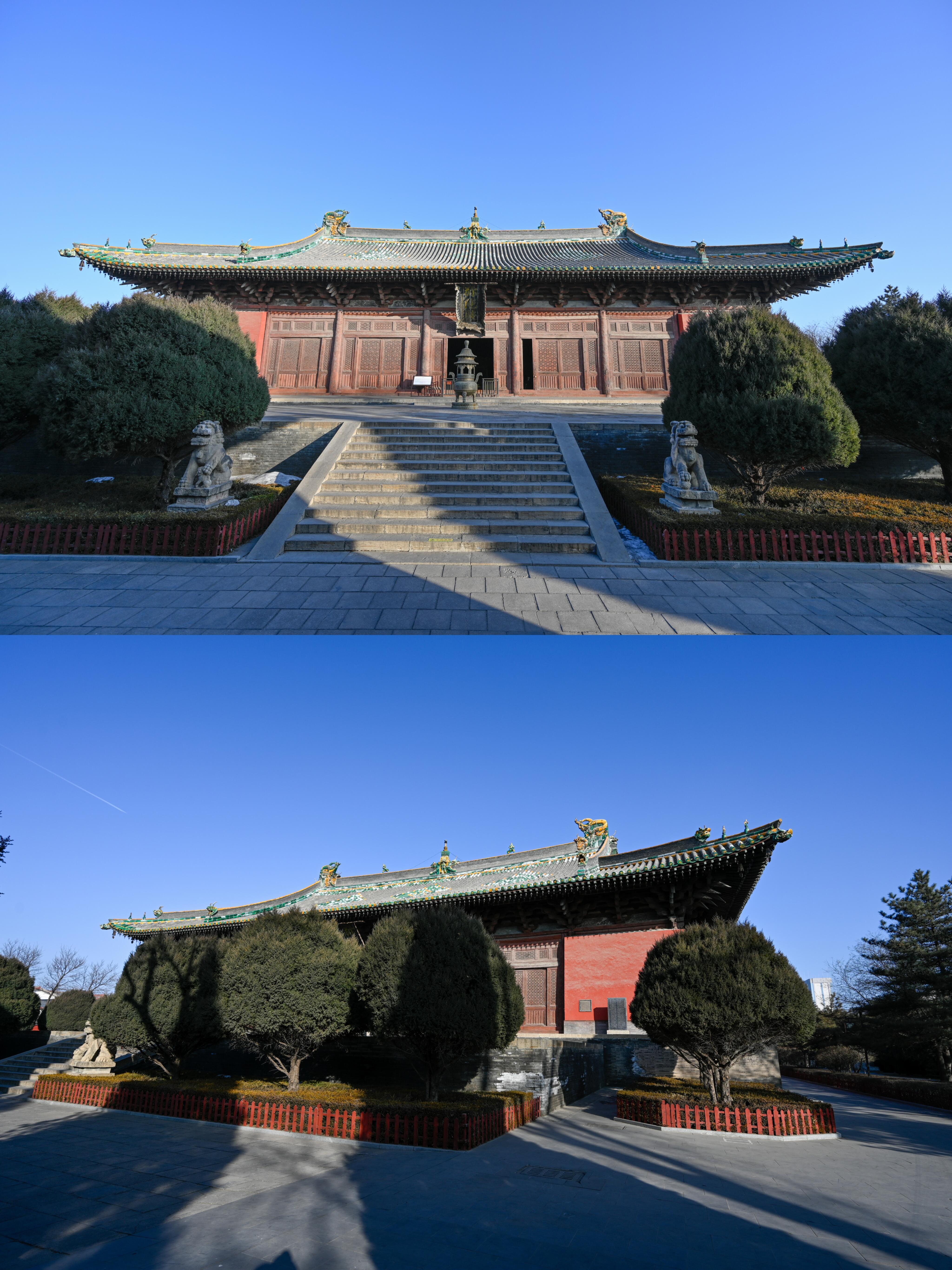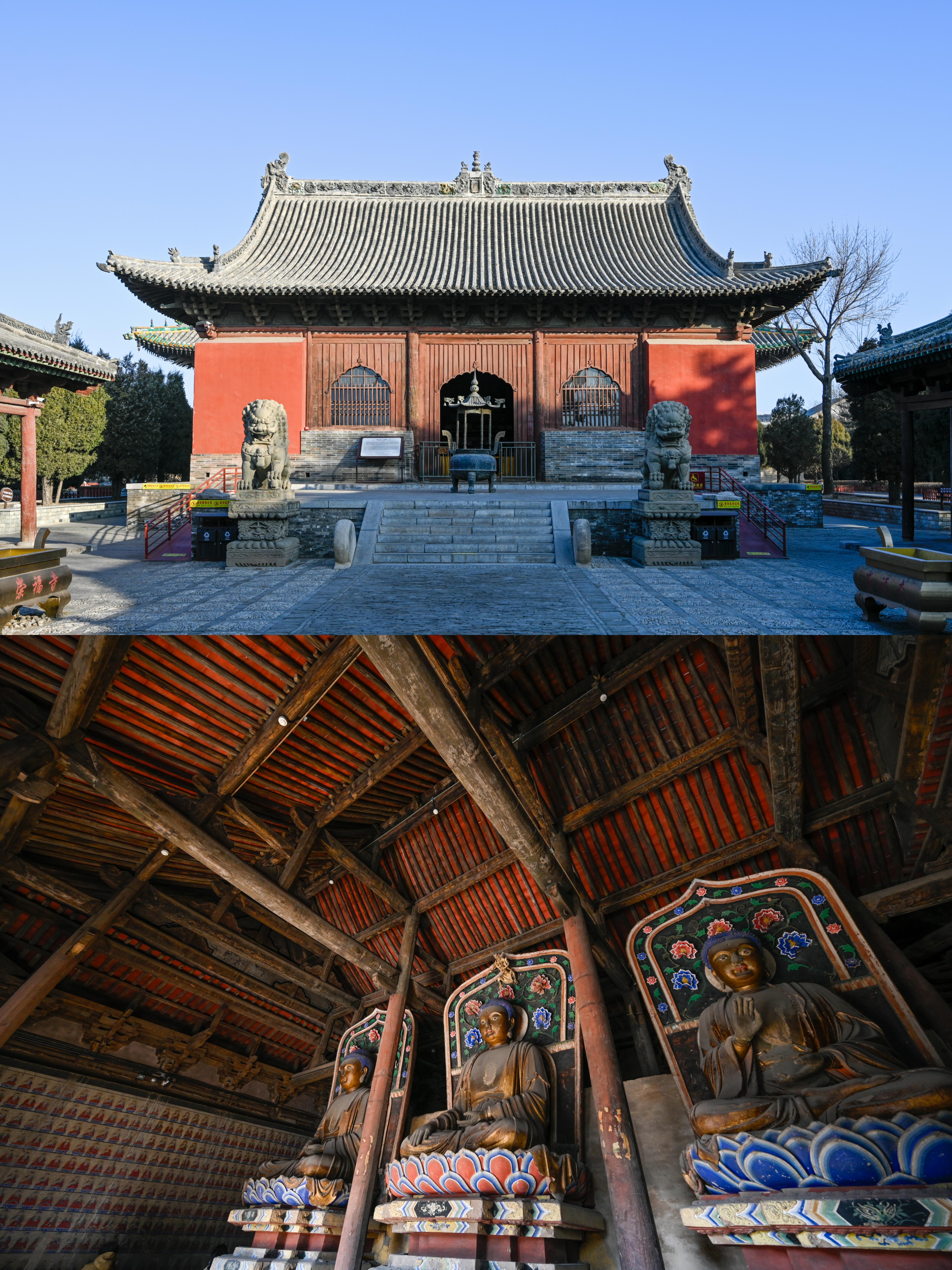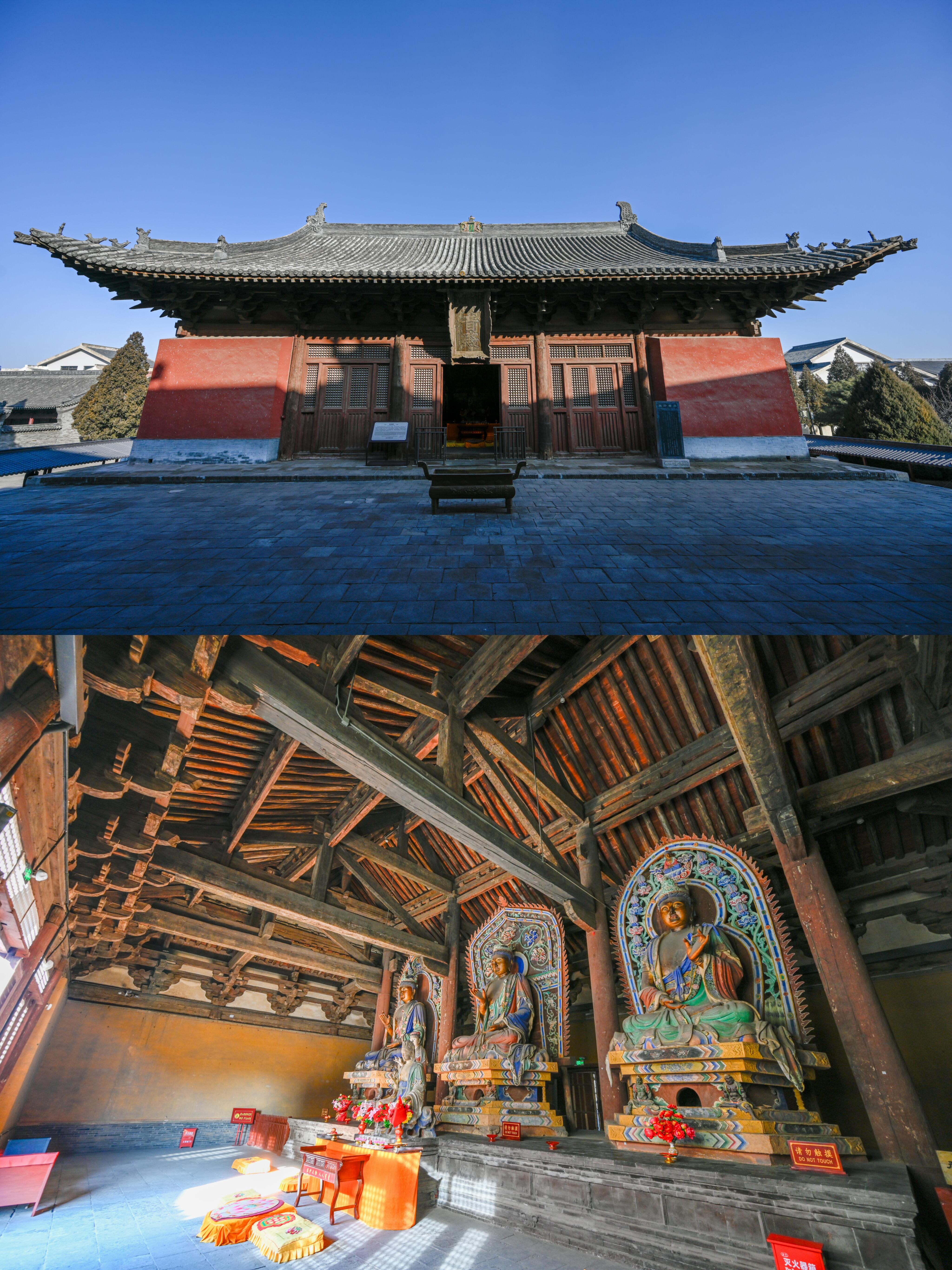 穿过山门,清代的金刚殿,明代的千佛阁与钟鼓楼,依次映入眼帘,明清的修缮与增补,让寺院的前半段多了几分温润与规整,千佛阁内曾经藏有御赐经文,后来供奉千佛,名字也由此而来,木质楼梯依旧可以登临,踩上去的吱呀声,像是在和数百年的时光对话。再往里走,明成化年间重建的大雄宝殿稳坐院中,东西山墙的千佛壁画密密麻麻,绘满了明代人的信仰,南北墙壁上还别出心裁地画了关羽、赵云等三国人物作为护法,把民间崇拜与佛教信仰巧妙融合,这种混搭在古寺里并不多见,也让人忍不住好奇,当年的工匠与施主,究竟怀着怎样的心思,把人间英雄请到佛前护持。但谁都清楚,崇福寺真正的灵魂,不在前几进院落,而在中轴线最深处的弥陀殿,这座建于金皇统三年,也就是1143年的大殿,是整座寺院的压舱石,与大同华严寺大雄宝殿、辽宁义县奉国寺大殿并称辽金三大佛殿,近二十二米的高度,单檐歇山顶,面阔七间,进深四间,站在殿前,不用刻意抬头,就能感受到来自八百年前的压迫感,那是木构建筑独有的力量感,不锋利,却厚重沉稳。