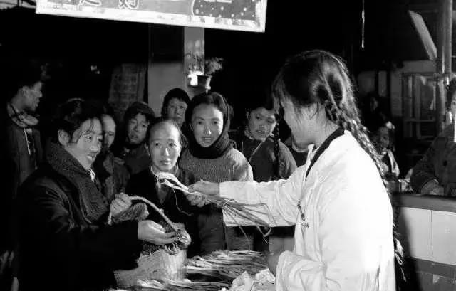 △1972年,南京街头的菜摊,营业员留了传统的大辫子,显得干净又利落。
