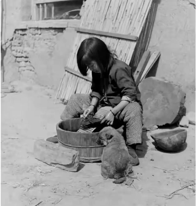 △1973年,郑州的农村,一个小姑娘正在自己洗衣服,旁边还卧着一条可爱的小狗。