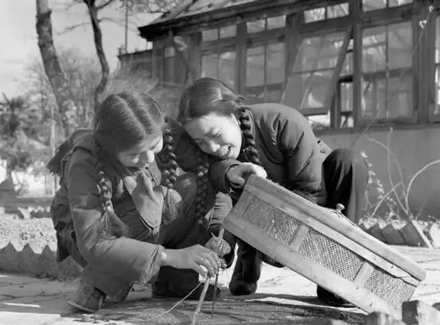 △1960年,两个姑娘正在捉麻雀。当时,麻雀和苍蝇、老鼠、蚊子被列为了四害。