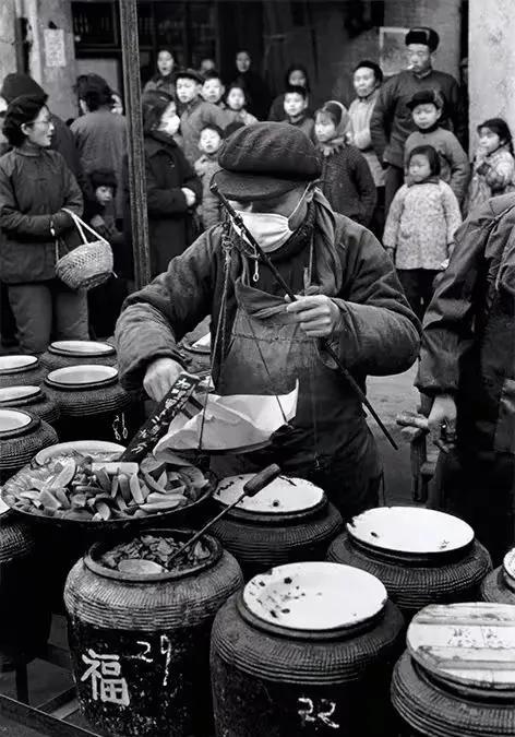 △1962年,上海街头的咸菜摊,瓶瓶罐罐摆了一堆,看起来相当丰盛