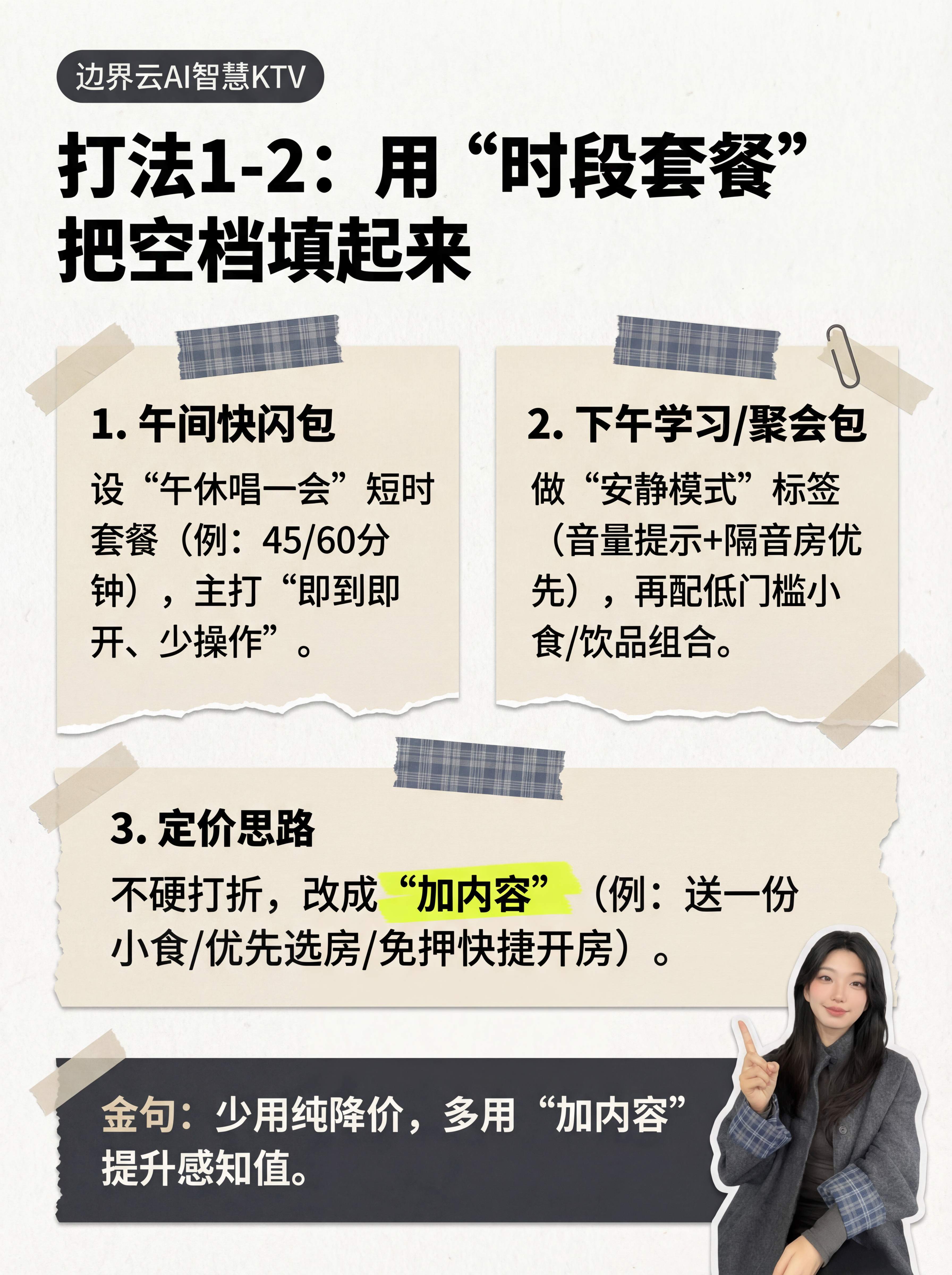 午间快闪包:推出"午休唱一会"短时套餐(45-60分钟),主打"即到即开、少操作",让上班族快速放松。