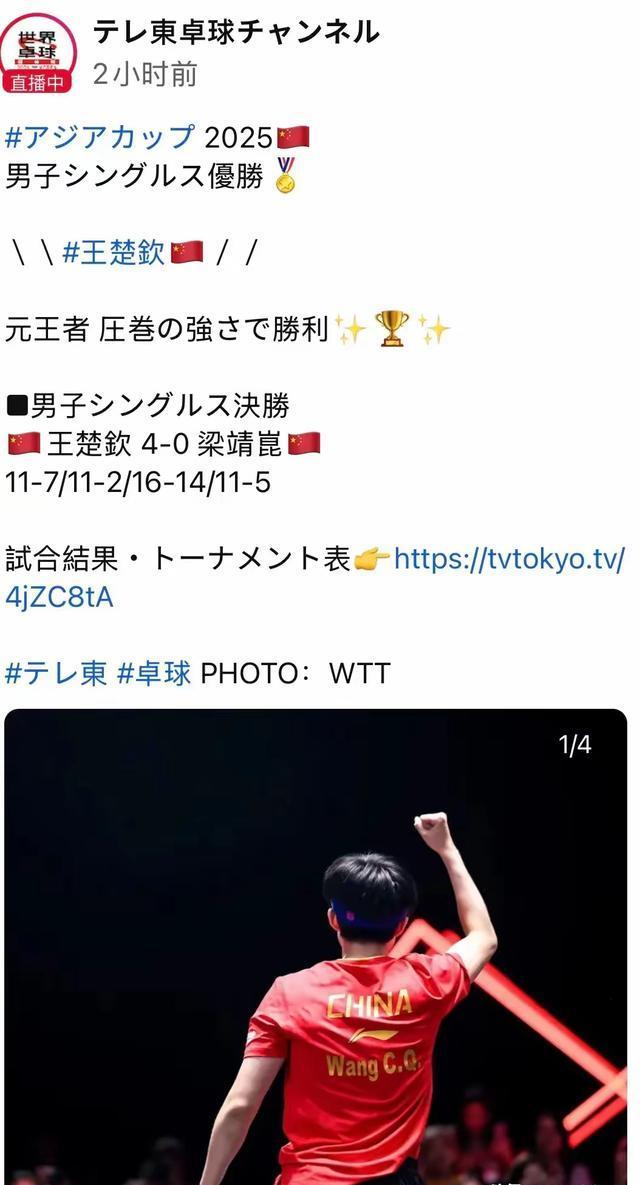 日本的乒乓球媒体呀,完全被王楚钦的魅力和实力给征服啦。等王楚钦夺了冠之后,他们立马就发文去祝贺呢,那胜利可真是压倒性的呀,祝贺王楚钦拿到这次亚洲杯的冠军咯。
