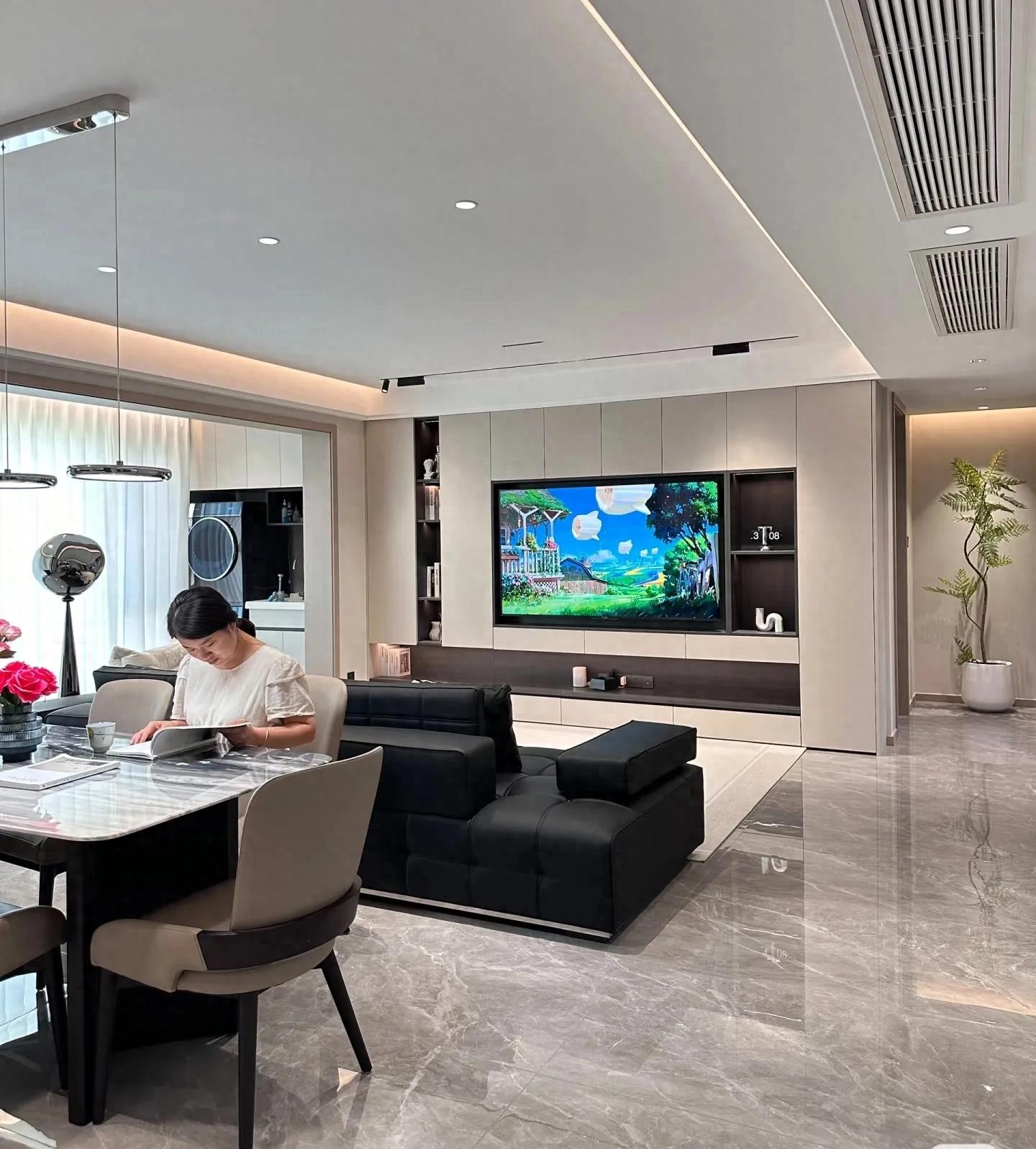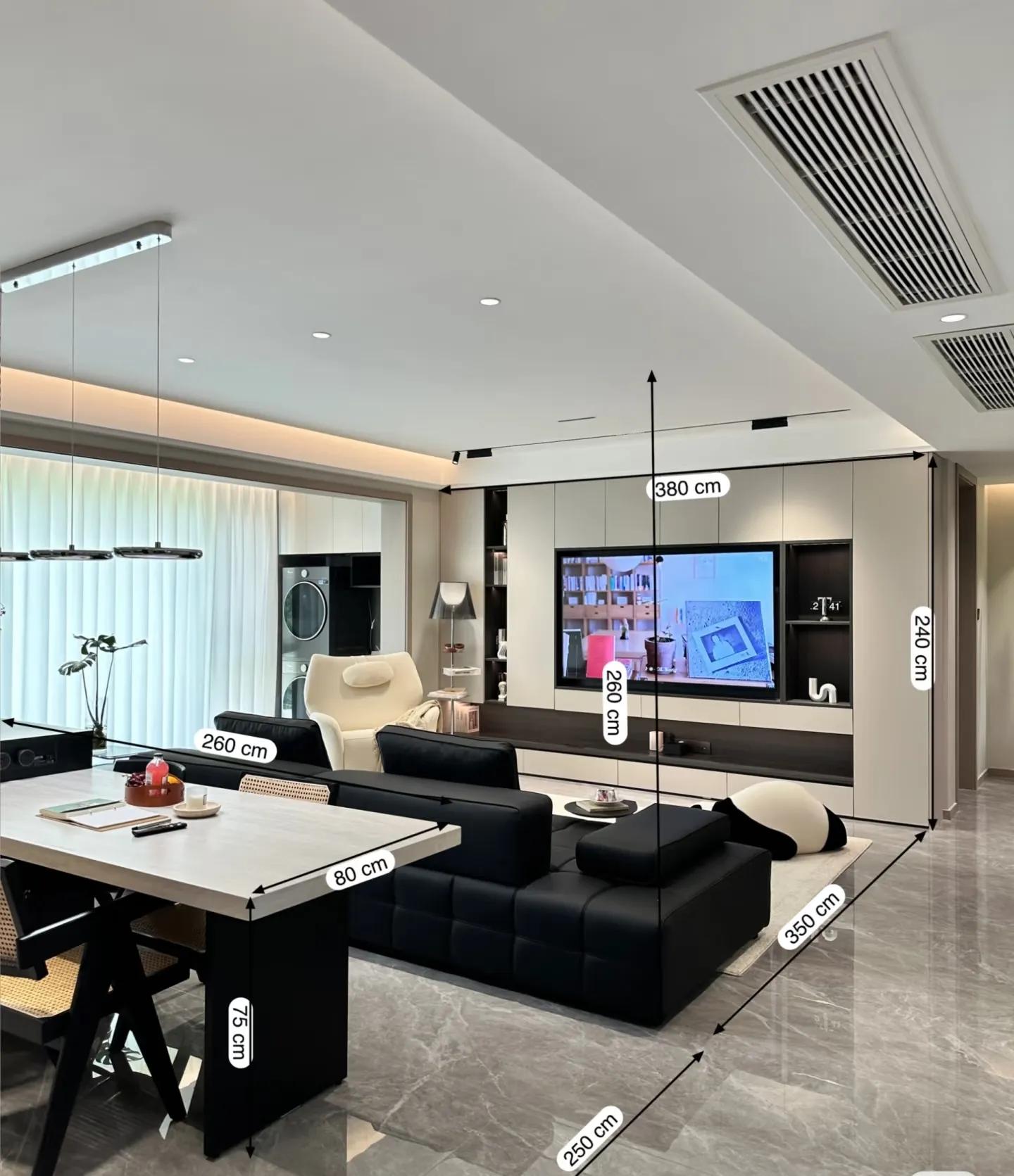 客厅区域开间6.81米,反正整体很开阔,地面整体通铺灰色亮面瓷砖,很耐脏,规格750/1500,美缝则是搭配的同色美缝。