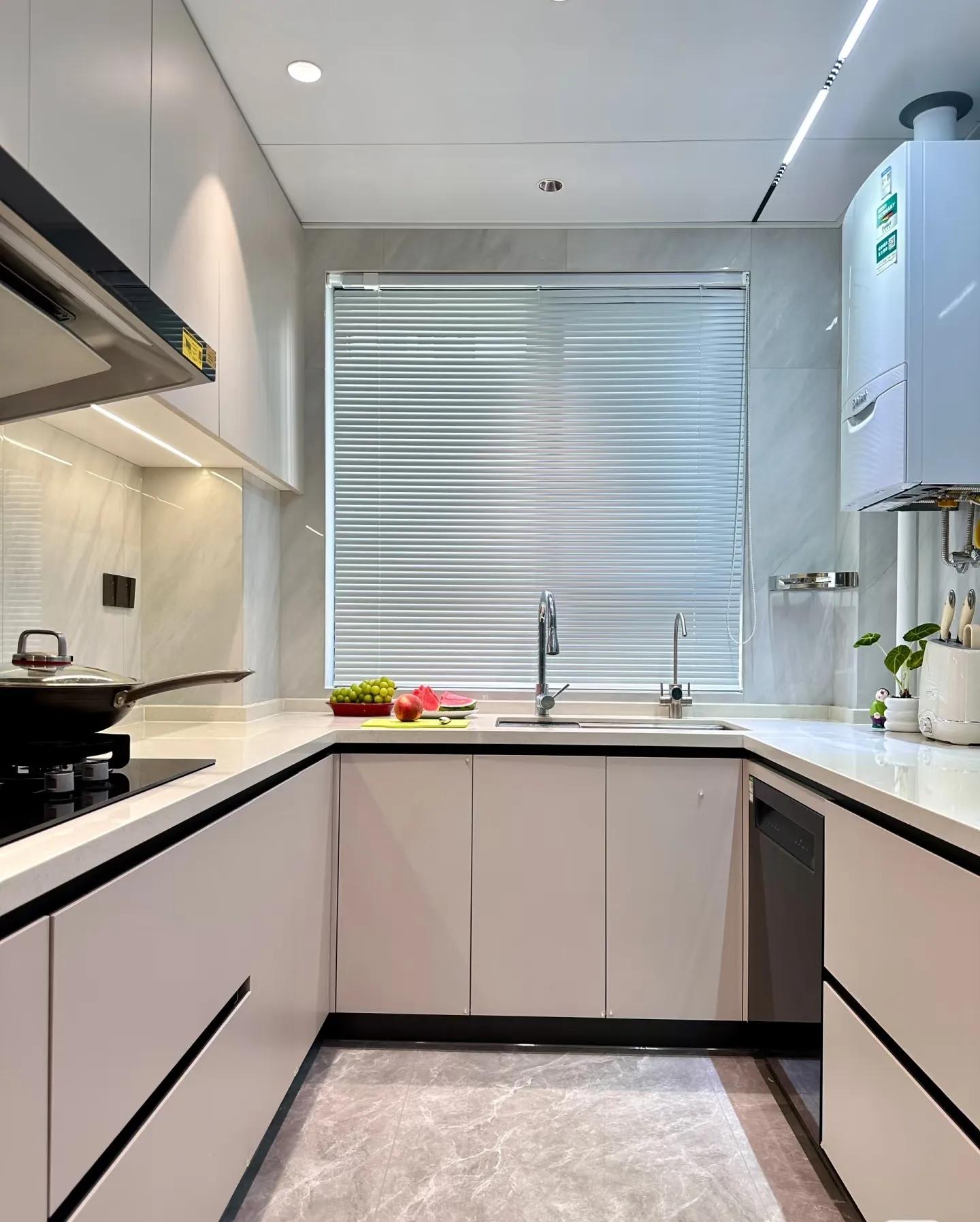 厨房区域橱柜U型设计,柜门平板门暖灰色,不要明拉手,水槽台下盆工艺,真心❤️不错!
