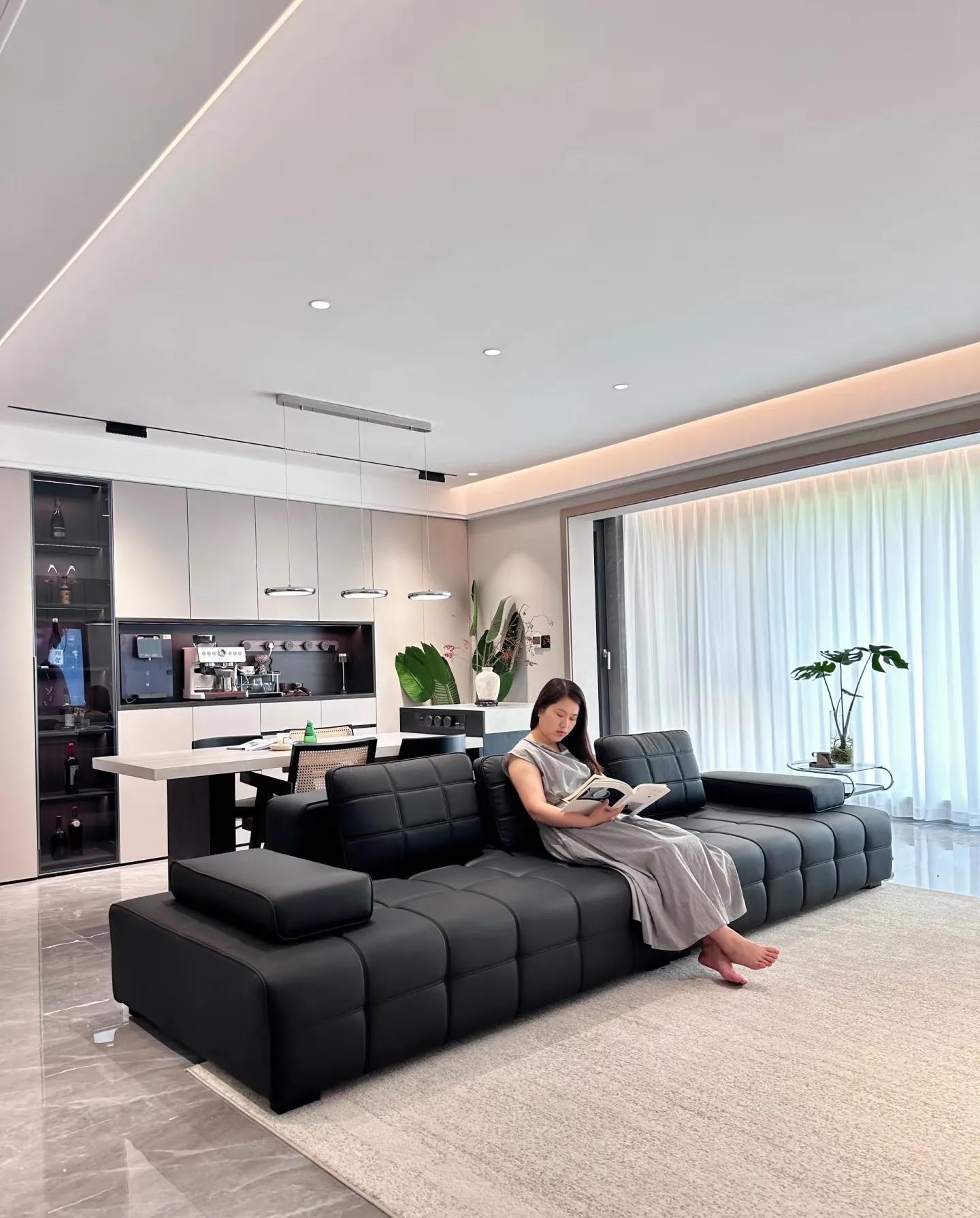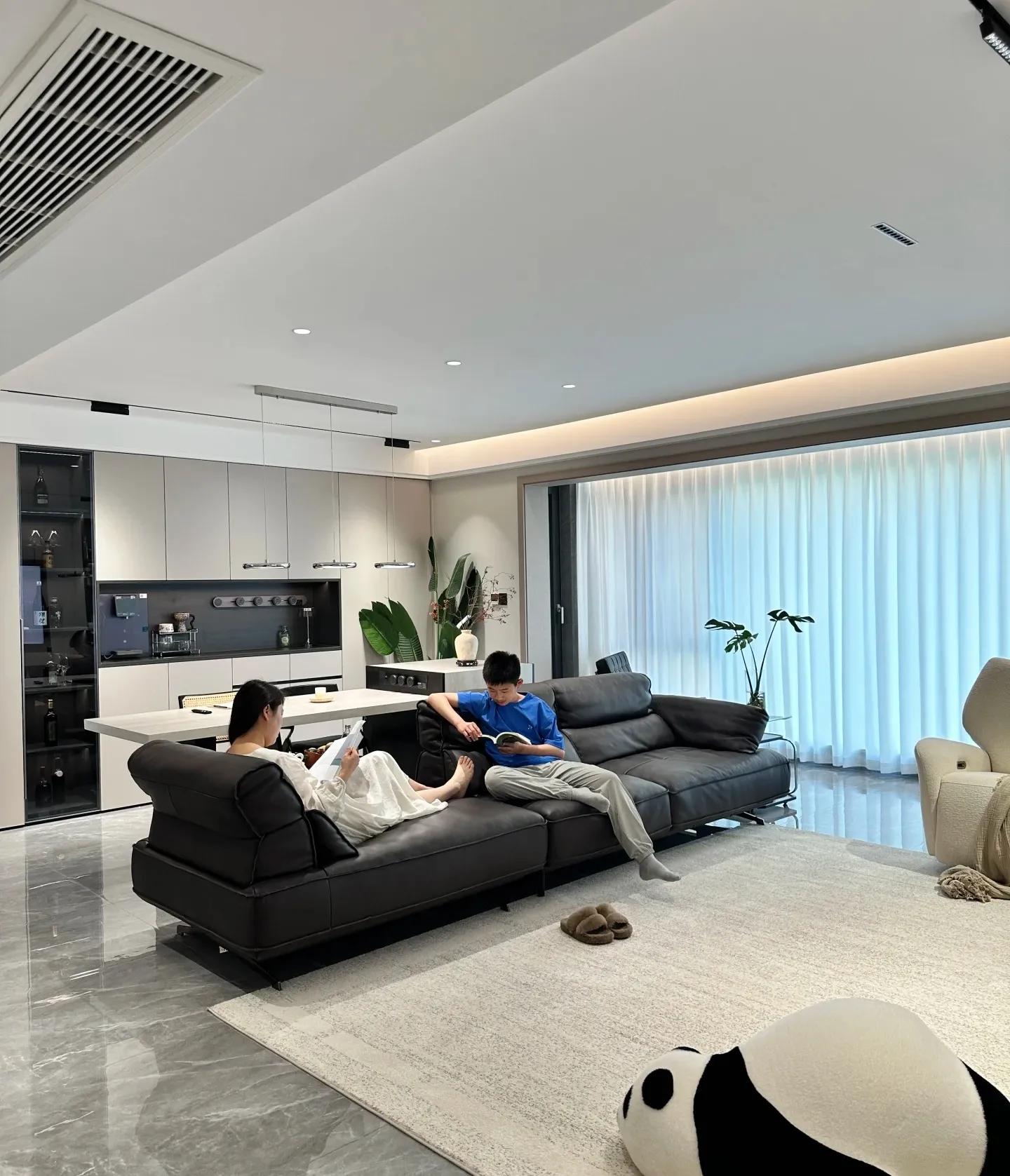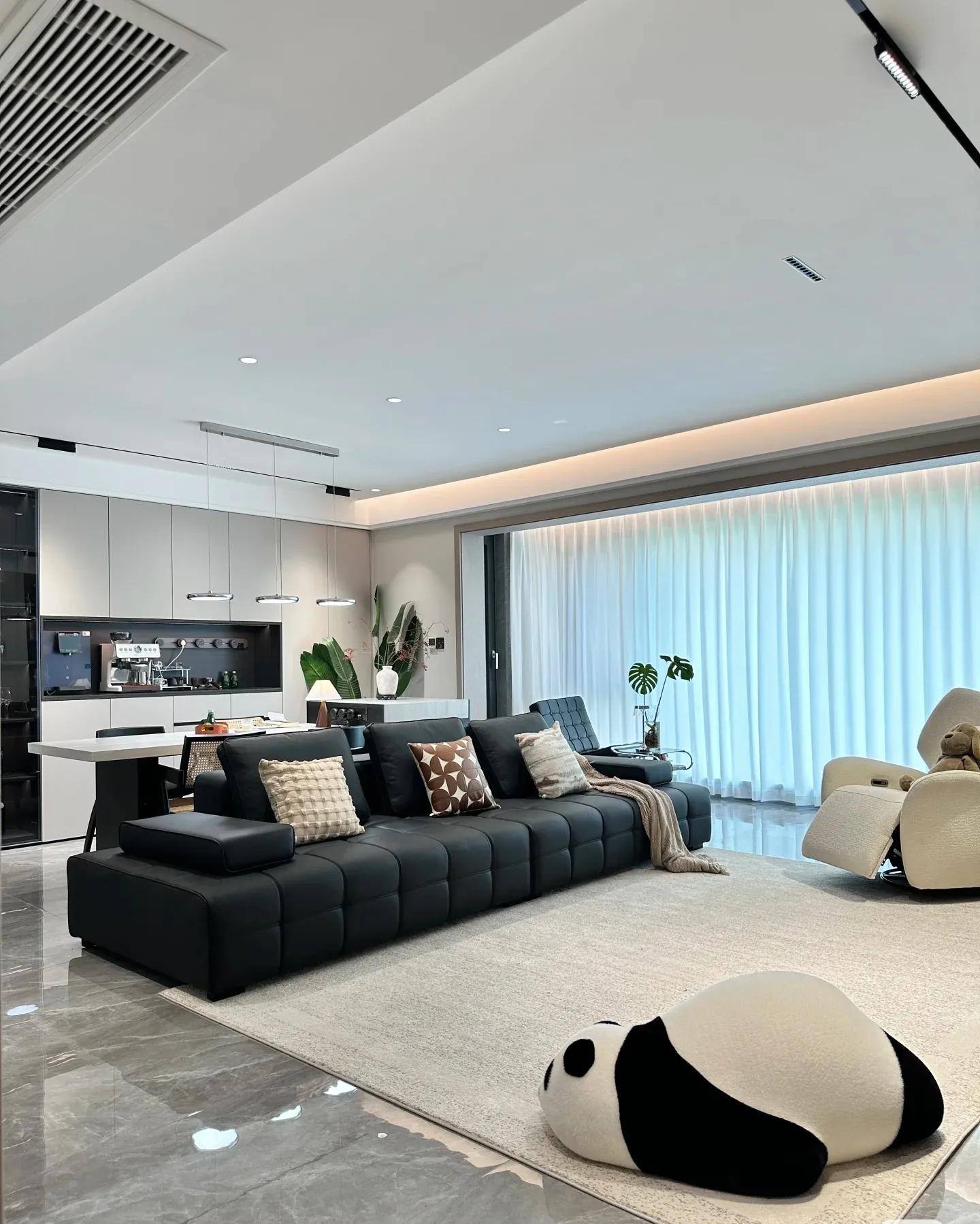 客厅区域家具与整体色调搭配统一,黑色直排沙发,旁边搭配单人灰色沙发️。灰色地毯。