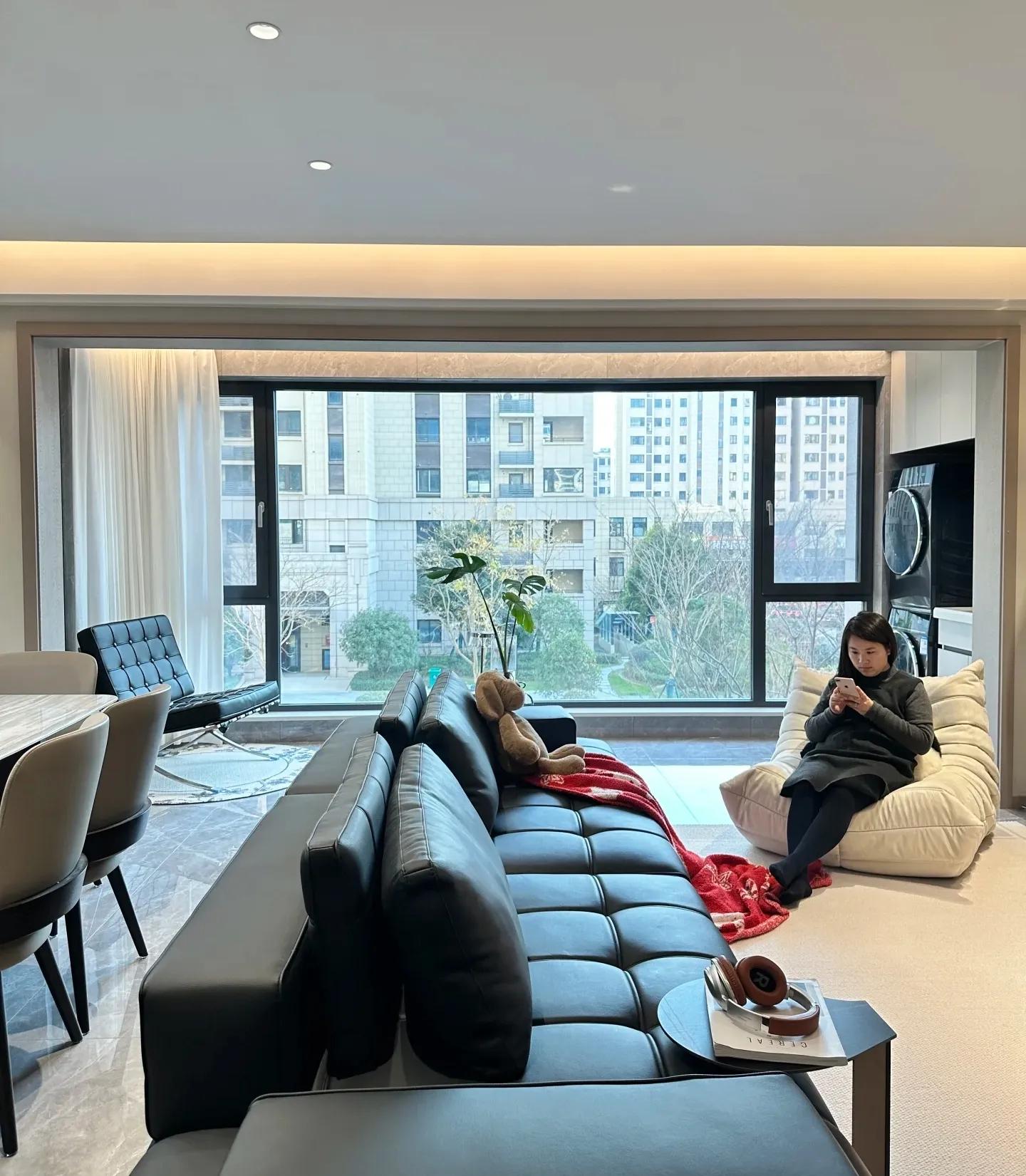 阳台区域与客厅区域打通,不要推拉门,空间的确开阔很多,阳台换落地大玻璃窗,视野真的非常不错。
