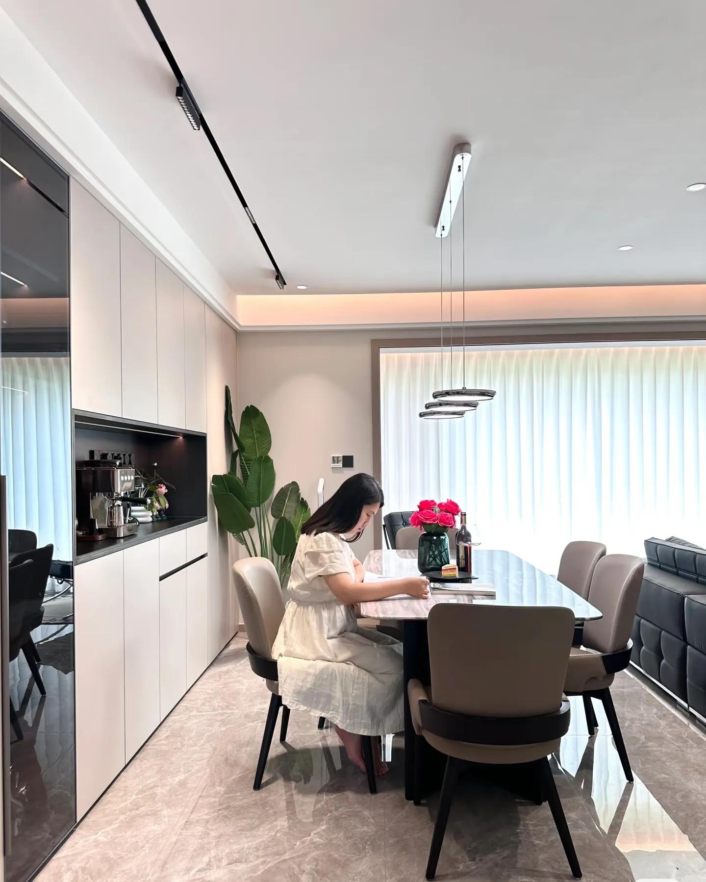 餐厅区域岛台➕餐桌美观,大方,又实用,岛台下方设计储物空间。上面搭配的是吊灯。侧面还是要有餐边柜,增加餐厅收纳,中间镂空,设计轨道插座,旁边玻璃门酒柜。